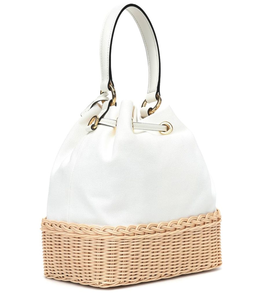 Opt for sophisticated summer style with this Plage wicker tote from Prada. Made in Italy, this beige and white style is accented with golden hardware, including the label’s signature logo detail. A leather drawstring cinches the canvas bucket-bag inspired pocket on this piece.