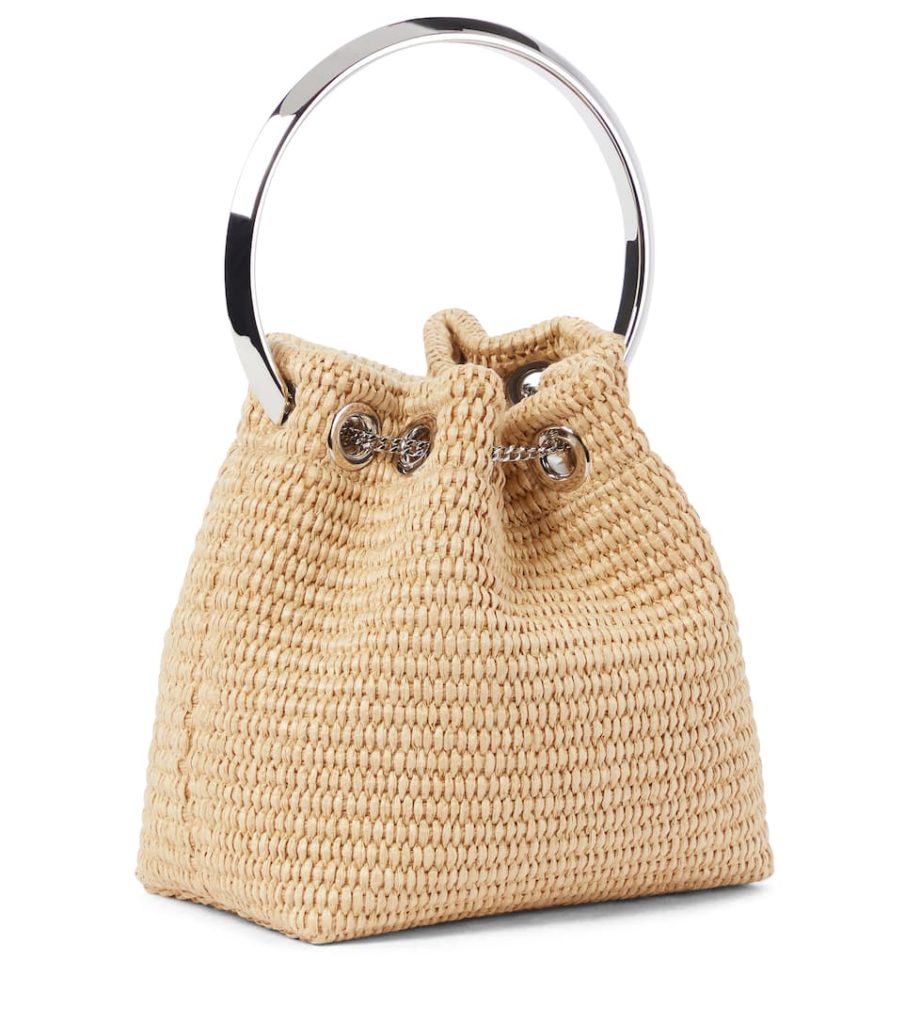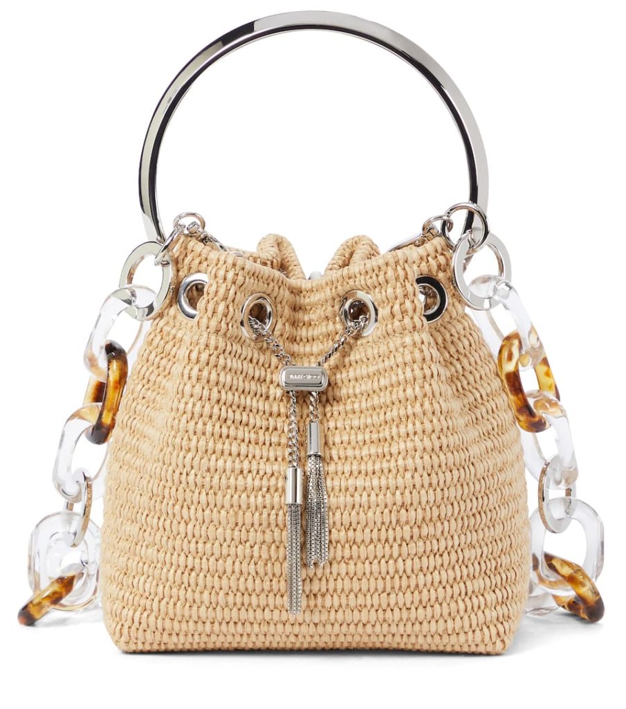 Jimmy Choo’s iconic Bon Bon bucket bag comes in woven raffia for the summer months. In classic beige, the petite chainlink drawstring style is framed with a curved silver-toned top handle. We adore the transparent and tortoiseshell detachable strap for an eye-catching finish.