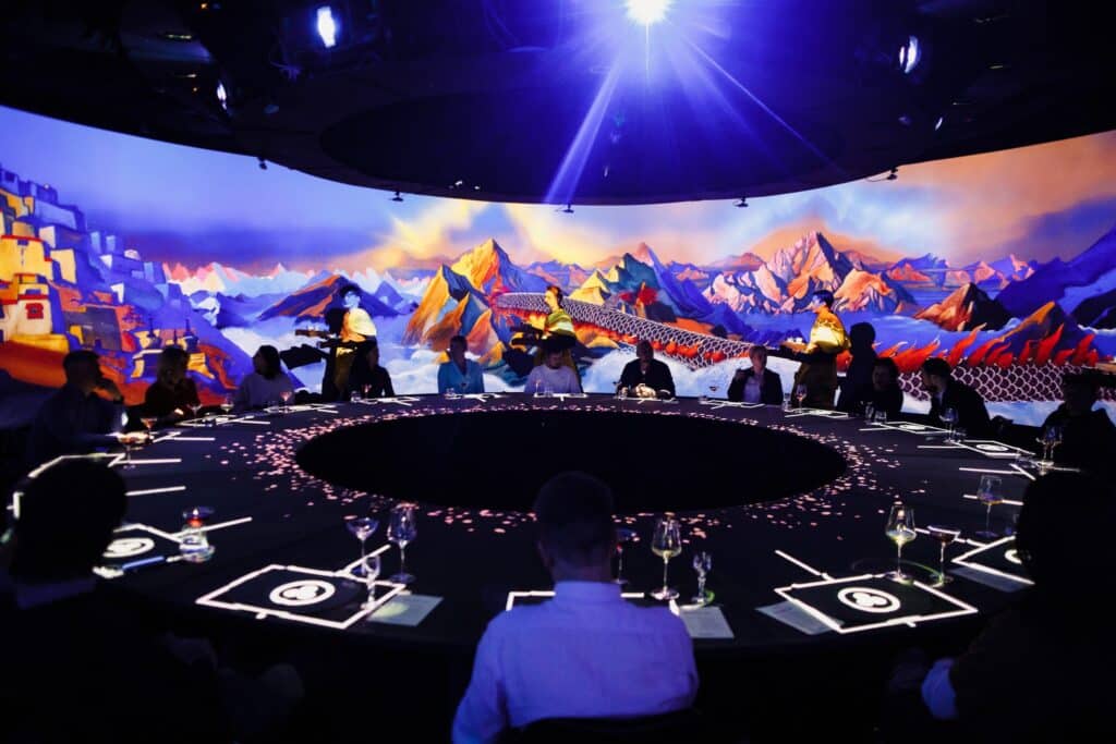 At Krasota, your dining experience occurs in a space akin to an auditorium, with a grand circular table accommodating up to 20 diners. Here, pixel-perfect 3D multimedia performances are seamlessly projected across curved walls and over the table. Each act of this gastro-performance aligns perfectly with each course on the set menu.