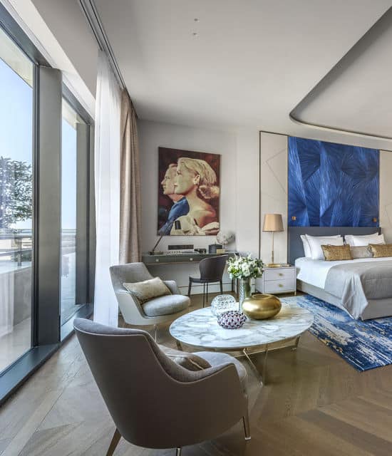 The Prince Rainier III Suite spans an impressive 830 square meters, bathed in natural light that pours through its windows, creating an atmosphere of warmth and elegance. The interior design seamlessly blends golden hues with vibrant colours, creating a harmonious contrast that adds to the suite’s visual appeal.